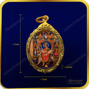 รายละเอียดสินค้า: จี้ภาพนวทุรคา แสดงถึงเก้าปางของพระแม่ทุรคา เทพีแห่งสงครามและการปกป้องจากสิ่งชั่วร้ายในศาสนาฮินดู พระแม่ทุรคาเป็นสัญลักษณ์ของพลังอำนาจและความกล้าหาญ ในจี้นี้พระแม่ทุรคาปรากฏในท่าประทับบนหลังเสือและแสดงพระหัตถ์หลายข้างที่ถืออาวุธต่างๆ สื่อถึงความสามารถในการขจัดอุปสรรคและความชั่วร้าย ด้านหลังของภาพประกอบด้วยรูปปางทั้งเก้าของพระแม่ทุรคาที่แตกต่างกันออกไป ขอบจี้ล้อมรอบด้วยทองชุบทองเหลืองที่แกะสลักลวดลายวิจิตร ทำให้จี้ชิ้นนี้ดูหรูหราและศักดิ์สิทธิ์