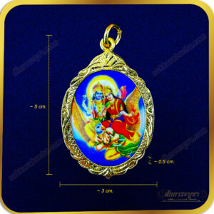 จี้ภาพพระนารายณ์และพระแม่ลักษมีทรงครุฑนี้เป็นสัญลักษณ์แห่งพลังอำนาจและความสมดุล เหมาะสำหรับผู้ที่ต้องการเสริมความมั่นคงและความสำเร็จในชีวิต