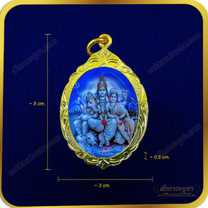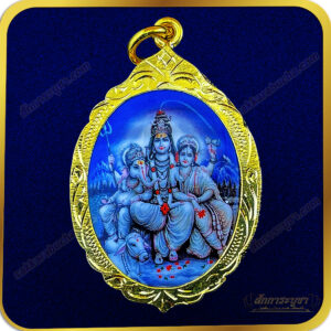รายละเอียดสินค้า: จี้ภาพพระศิวะ พระแม่อุมาเทวี และพระพิฆเนศวร เป็นเครื่องรางที่รวบรวมพลังอำนาจแห่งครอบครัวศักดิ์สิทธิ์ในศาสนาฮินดู พระศิวะเทพเจ้าแห่งการทำลายและฟื้นฟู ประทับคู่กับพระแม่อุมาเทวี เทพีแห่งพลังและความกล้าหาญ พร้อมด้วยพระพิฆเนศวร ผู้เป็นบุตรและเทพแห่งความสำเร็จและการขจัดอุปสรรค ภาพนี้แสดงถึงความสมดุลของพลังอำนาจและความกลมเกลียวของครอบครัวศักดิ์สิทธิ์ ขอบจี้ล้อมด้วยทองชุบทองเหลืองที่แกะสลักอย่างประณีต สร้างความศักดิ์สิทธิ์และความงดงามให้กับเครื่องรางชิ้นนี้