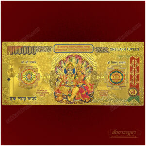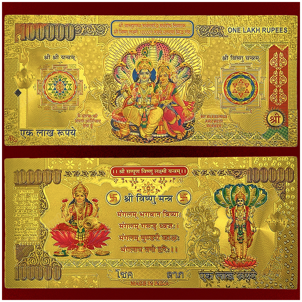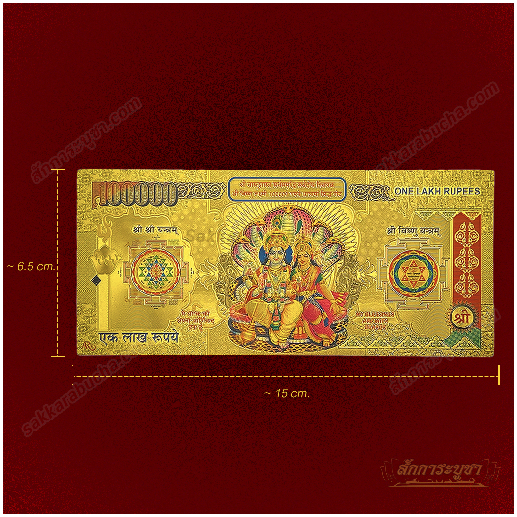 ลักษณะทั่วไป: ธนบัตรทองขนาด 15×6.5 ซม. แสดงภาพของพระนารายณ์ (พระวิษณุ) และพระแม่ลักษมี ผู้ที่เป็นคู่บารมีกัน พระนารายณ์เป็นเทพผู้รักษาสมดุลของโลกและจักรวาล พระแม่ลักษมีเป็นเทวีแห่งความเจริญรุ่งเรือง และโชคลาภ ภาพด้านหน้าของธนบัตรแสดงให้เห็นถึงพระนารายณ์และพระแม่ลักษมีที่นั่งบนหลังพญานาคศักดิ์สิทธิ์ นาคอนันตะ รวมถึงยันต์ที่ช่วยเสริมสิริมงคลในการบูชา