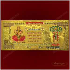 แผ่นธนบัตรทองพระนารายณ์และพระแม่ลักษมี ขนาด 15×6.5 ซม. เป็นเครื่องรางมงคลที่สื่อถึงการบูชาเพื่อขอพรเรื่องความสำเร็จ ความเจริญรุ่งเรือง และโชคลาภในด้านการงานและการเงิน ธนบัตรทองนี้แสดงถึงภาพของพระนารายณ์ (พระวิษณุ) ร่วมกับพระแม่ลักษมี เทวีแห่งความมั่งคั่ง ทั้งสองพระองค์เชื่อว่าจะประทานความอุดมสมบูรณ์และความมั่งคั่งให้กับผู้บูชา
