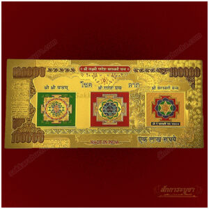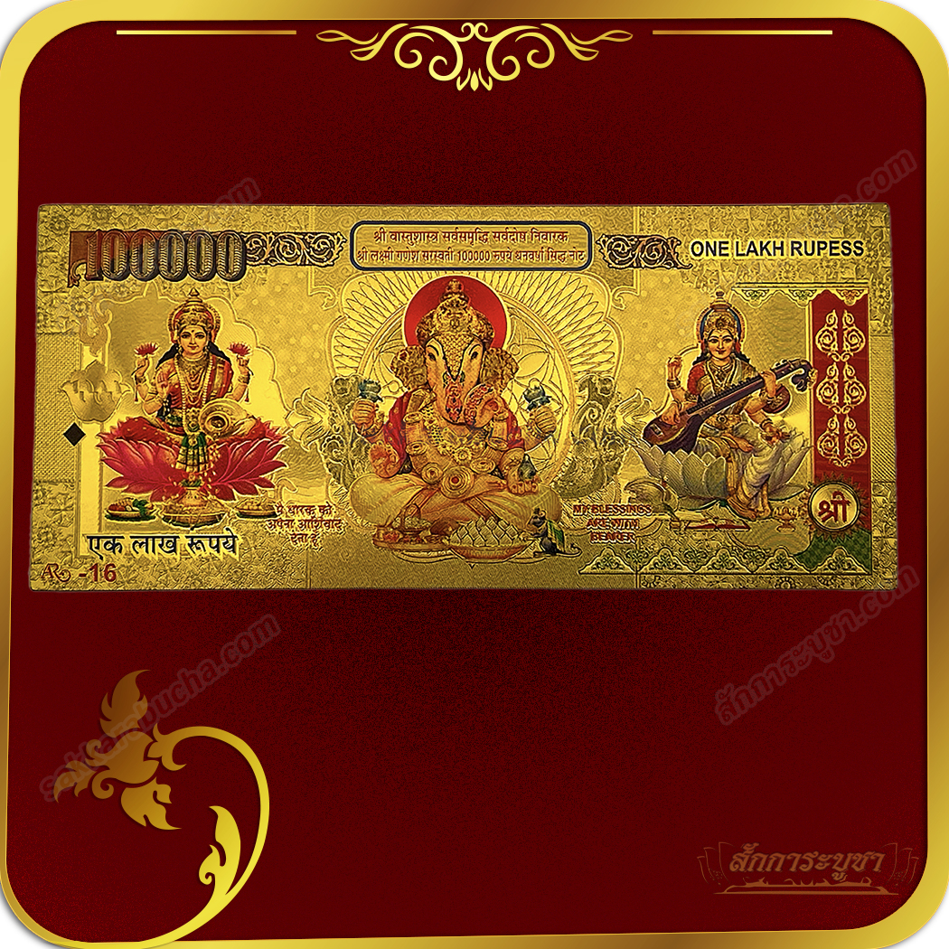 ลักษณะทั่วไป: ธนบัตรทองขนาด 15×6.5 ซม. แสดงภาพของพระพิฆเนศ (Ganesha) พระแม่ลักษมี (Lakshmi) และพระแม่สรัสวดี (Saraswati) ซึ่งเป็นเทพเจ้าที่ได้รับการนับถืออย่างแพร่หลาย ภาพของพระพิฆเนศสื่อถึงการขจัดอุปสรรคและการประทานปัญญา พระแม่ลักษมีเป็นสัญลักษณ์ของความมั่งคั่งและโชคลาภ ส่วนพระแม่สรัสวดีเป็นเทพแห่งความรู้และศิลปะ นอกจากนี้ด้านหลังธนบัตรยังมีภาพยันต์ศักดิ์สิทธิ์ ซึ่งเสริมพลังมงคลในทุกด้าน