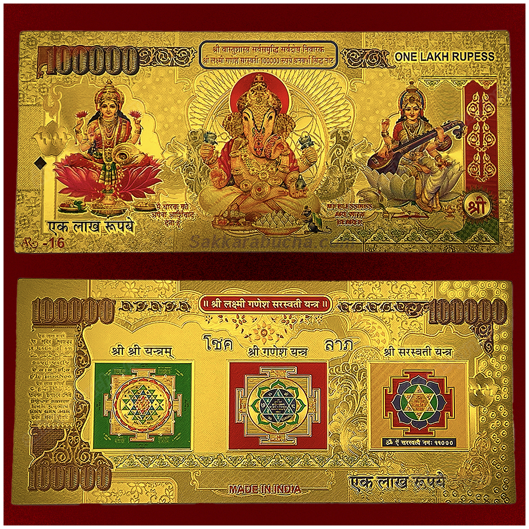 การบูชาพระพิฆเนศ พระแม่ลักษมี และพระแม่สรัสวดีเชื่อว่าจะช่วยเสริมพลังแห่งความรู้ ปัญญา และโชคลาภ นอกจากนี้การพกพาธนบัตรทองนี้ยังช่วยเสริมดวงด้านการเงิน การงาน และความสำเร็จในทุกด้าน การบูชามักใช้ดอกไม้และธูป พร้อมกับการตั้งจิตอธิษฐานขอพรให้ได้รับความเจริญรุ่งเรือง
