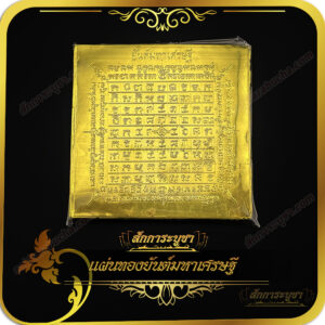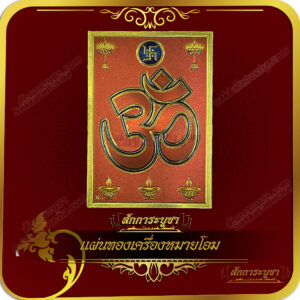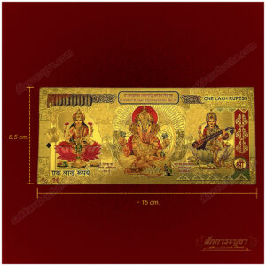 แผ่นธนบัตรทองพระพิฆเนศ ขนาด 15×6.5 ซม. ในภาพนี้เป็นเครื่องรางมงคลที่แสดงภาพของพระพิฆเนศ พระแม่ลักษมี และพระแม่สรัสวดี ซึ่งเป็นเทพที่เกี่ยวข้องกับการประทานพรในด้านปัญญา ความมั่งคั่ง และความสำเร็จ ธนบัตรทองนี้ถือเป็นสัญลักษณ์ของความเจริญรุ่งเรืองในทุกด้าน โดยเฉพาะเรื่องการเงิน การงาน และการศึกษา