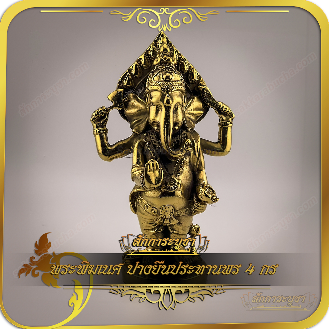 พระพิฆเนศ ปางยืนประทานพร 4 กร เป็นปางที่ได้รับการยกย่องในฐานะเทพแห่งการประทานพรและความสำเร็จ สี่กรของพระองค์แต่ละกรถืออาวุธและสิ่งศักดิ์สิทธิ์ที่มีความหมายในการขจัดปัญหาและอุปสรรค