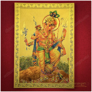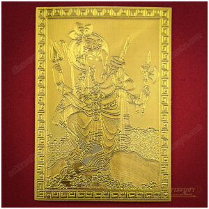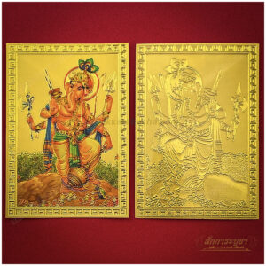 ลักษณะทั่วไป: แผ่นทองขนาดเล็ก พกพาสะดวก ขนาด 6×8.5 ซม. ภาพพระพิฆเนศในปางที่มีอาวุธอยู่ในมือ อาทิ ตรีศูล และขวาน ซึ่งเป็นสัญลักษณ์ของพลังอำนาจในการขจัดอุปสรรค พระองค์ทรงแต่งกายด้วยเครื่องประดับที่งดงาม สีสันสดใส และยืนอยู่บนแท่นที่เต็มไปด้วยความอุดมสมบูรณ์ เป็นภาพที่แสดงถึงความแข็งแกร่งและความสง่างาม