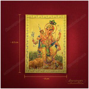 แผ่นทองพระพิฆเนศ ขนาด 6×8.5 ซม. เป็นเครื่องรางมงคลที่แสดงถึงองค์พระพิฆเนศในอีกหนึ่งปางที่แสดงถึงพลังและการปกป้อง เชื่อกันว่าพระพิฆเนศเป็นเทพแห่งความสำเร็จ ความรู้ และการเริ่มต้นใหม่ พระองค์เป็นเทพเจ้าที่ผู้คนศรัทธาอย่างมากในศาสนาฮินดูและยังได้รับการบูชาทั่วโลก