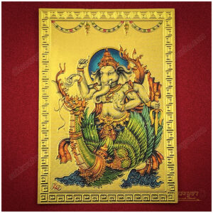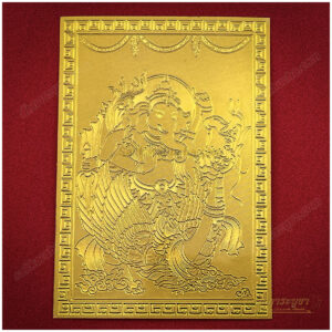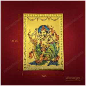 ลักษณะทั่วไป: แผ่นทองขนาด 6×8.5 ซม. มีภาพพระพิฆเนศประทับบนหงส์ ซึ่งเป็นสัญลักษณ์แห่งความสูงส่งและความบริสุทธิ์ ภาพแสดงถึงความสง่างามและทรงพลังของพระพิฆเนศ รอบภาพตกแต่งด้วยลวดลายที่ละเอียดอ่อน เพิ่มความงดงามและขลัง