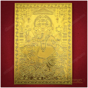 ลักษณะทั่วไป: แผ่นทองขนาด 6×8.5 ซม. แสดงภาพพระพิฆเนศนั่งประทับบนบัลลังก์ ถือดอกบัวและอาวุธศักดิ์สิทธิ์ อีกมือหนึ่งประทานพรให้ผู้บูชา ในภาพยังประกอบด้วยสัญลักษณ์มงคลอื่น ๆ เช่น หนูซึ่งเป็นพาหนะของพระพิฆเนศ และวัตถุที่เป็นตัวแทนของความมั่งคั่งและความสำเร็จ