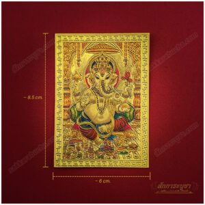 แผ่นทองพระพิฆเนศ ขนาด 6×8.5 ซม. ในภาพนี้เป็นเครื่องรางมงคลที่แสดงภาพของ “พระพิฆเนศ” (Ganesha) เทพเจ้าแห่งปัญญา ความสำเร็จ และการขจัดอุปสรรค พระพิฆเนศได้รับการบูชาในฐานะเทพเจ้าผู้ช่วยให้ชีวิตราบรื่นและประสบความสำเร็จ พระองค์ถือเป็นเทพเจ้าที่เป็นที่เคารพนับถืออย่างกว้างขวางในหมู่ผู้ที่ทำธุรกิจ การศึกษา และการเริ่มต้นสิ่งใหม่ๆ