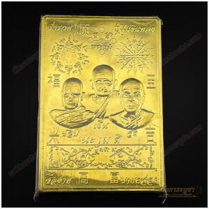 แผ่นทองมงคล ขนาด 5.5×8 ซม. เป็นเครื่องรางมงคลที่สลักภาพของพระเกจิอาจารย์ 3 ท่าน ได้แก่ หลวงพ่อชอบ หลวงพ่อเงิน และหลวงพ่อสด ที่ได้รับการเคารพและบูชาอย่างกว้างขวางในวงการพุทธศาสนา รูปแบบของแผ่นทองนี้เน้นการสื่อถึงความเมตตาและอำนาจบารมีของทั้งสามท่าน ที่มีชื่อเสียงในการช่วยเหลือผู้คนให้พ้นจากอุปสรรคและเสริมความเจริญรุ่งเรืองในชีวิต
