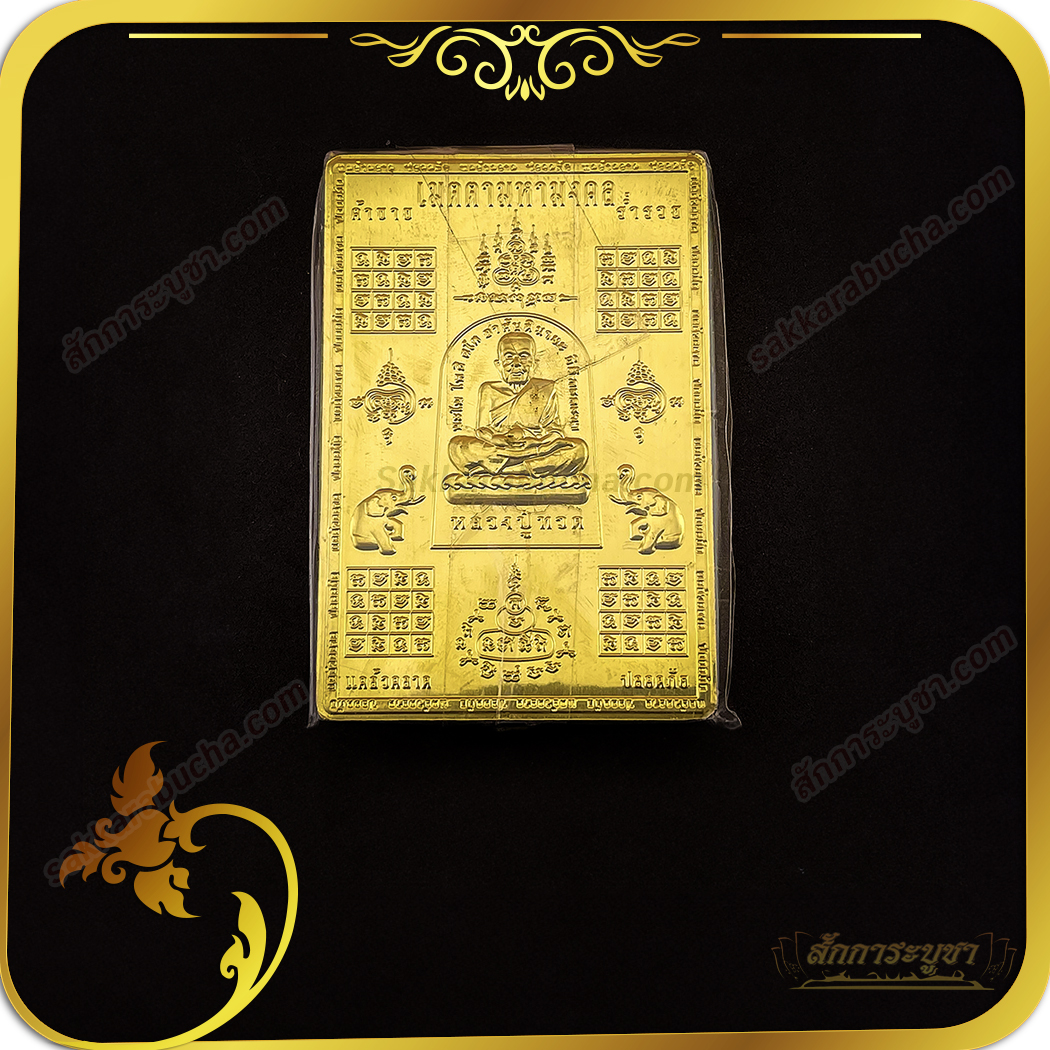 รายละเอียดของสินค้า แผ่นทองนี้มีขนาด 5.5×8 ซม. แกะสลักภาพหลวงปู่ทวดในท่านั่งสมาธิ ซึ่งแสดงถึงความเมตตาและพุทธคุณของท่าน ล้อมรอบด้วยยันต์ศักดิ์สิทธิ์และคาถามงคลที่ช่วยเสริมพลังในการปกป้องคุ้มครอง วัสดุที่ใช้ทำจากทองคุณภาพสูง มีความเงางามและทนทาน เหมาะสำหรับการพกพาหรือวางไว้ในที่สำคัญ เพื่อเสริมสิริมงคลในชีวิตประจำวัน