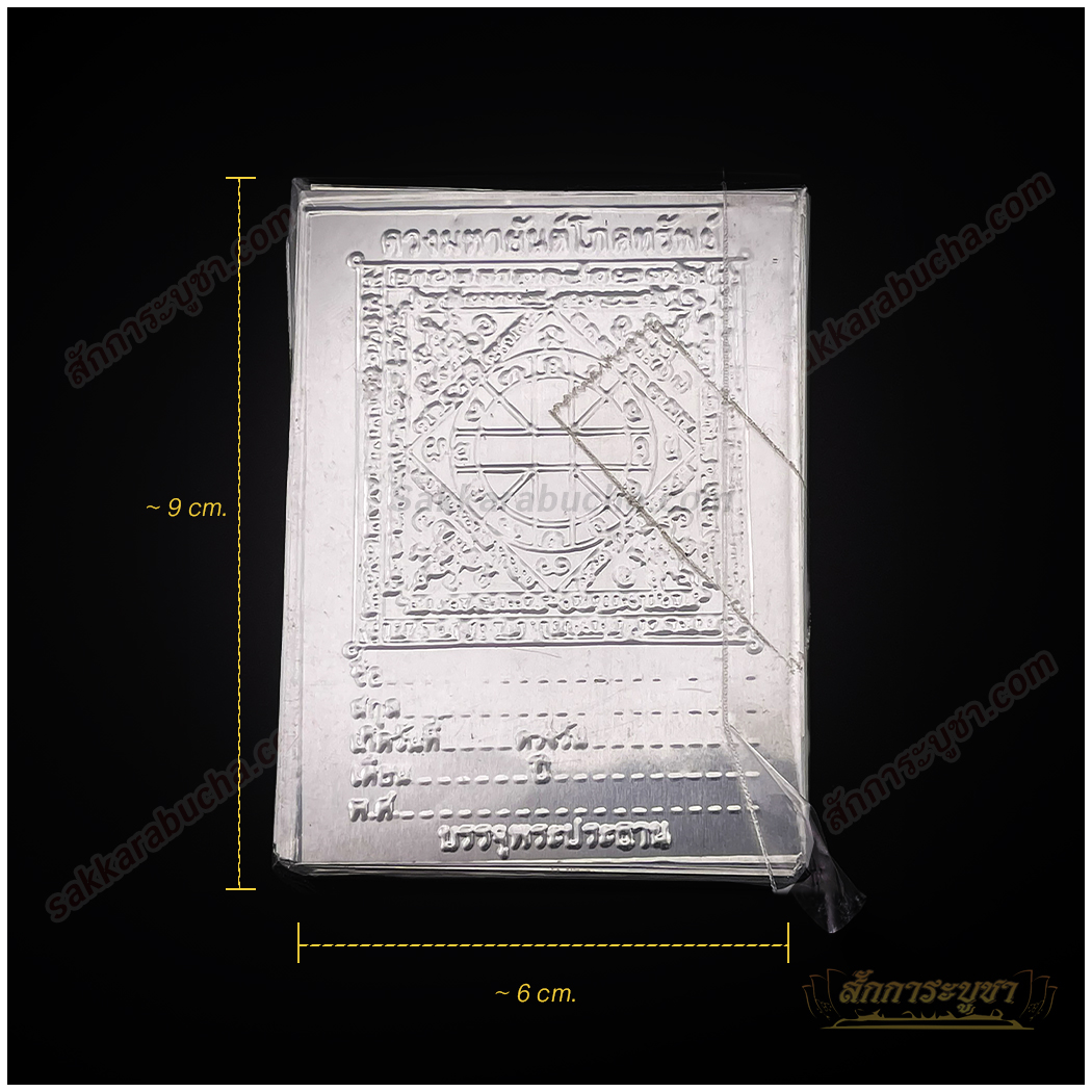 แผ่นเงินดวงมหายันต์ ขนาด 6×9 ซม. เป็นเครื่องรางมงคลที่สร้างขึ้นเพื่อเสริมดวงชะตาและปกป้องคุ้มครองจากสิ่งไม่ดี แผ่นเงินนี้ถูกออกแบบอย่างปราณีตด้วยการแกะสลักลวดลายดวงมหายันต์ ซึ่งถือเป็นสัญลักษณ์แห่งความเป็นมงคล ช่วยเสริมโชคลาภ ปกป้องจากอุปสรรคและปัญหา รวมถึงเสริมดวงในด้านความสำเร็จและความมั่งคั่ง